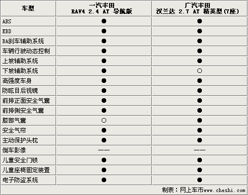 從上表我們可以看到,在電子主動(dòng)安全系統(tǒng)的配備中,ABS+EBD、動(dòng)態(tài)穩(wěn)定系統(tǒng)和6安全氣囊均成為了一汽豐田RAV4 2.4自動(dòng)導(dǎo)航版和廣汽豐田漢蘭達(dá)2.7精英型7座的標(biāo)準(zhǔn)配置。但仔細(xì)看下來它們還是略有不同。豐田RAV4再配備了上坡輔助系統(tǒng)的同時(shí),還配備下坡輔助系統(tǒng),確保車輛在斜坡上能以穩(wěn)定速度的行駛。而漢蘭達(dá)則是配備了膝部氣囊,可以有效的降低事故發(fā)生后對乘客的傷害。比較遺憾的是這兩款車型均沒有配備倒車輔助系統(tǒng)。