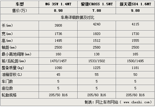 三款車的車體尺寸差距較明顯,不論外觀尺寸還是軸距均有所不同,駿捷的長(zhǎng)/寬/高三項(xiàng)均明顯優(yōu)于名爵MG3與天語(yǔ),而軸距方面也是駿捷CROSS更勝一籌,所以三車的內(nèi)部空間相比起來(lái)自然是剛剛上市的駿捷CROSS更寬大一些。其它方面如輪轂輪胎尺寸則相差不多,三車輪胎寬度均符合跨界車的多面性要求。