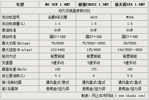 在動(dòng)力方面,三款車型的排量分別為1.6L,1.5L以及1.4L,在排量不同的基礎(chǔ)上,天語(yǔ)以及名爵MG3在功率輸出方面表現(xiàn)更佳,而駿捷CROSS則在扭矩的輸出方面表現(xiàn)的較為突出。最高車速方面三車相差僅10公里/每小時(shí),底盤的懸架設(shè)計(jì)也基本一致,但是駿捷CROSS的前后盤式制動(dòng)顯然要優(yōu)于MG3的前盤后鼓的制動(dòng)設(shè)計(jì),而排量更高的天語(yǔ)則凸顯了日系車的油耗優(yōu)勢(shì)。