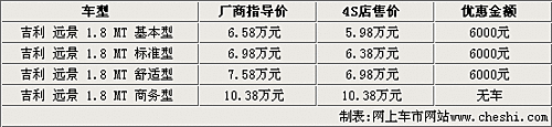 據(jù)吉利汽車4S店銷售人員介紹,吉利遠(yuǎn)景目前商務(wù)型仍然沒有現(xiàn)車,其他車型的貨源比較充足,而且有6000元的優(yōu)惠。另外,消費者到店購車還可以贈送裝飾。啟用吉利全新車標(biāo)的EC718將很快上市,在車型配置以及車型級別將高于現(xiàn)款遠(yuǎn)景,預(yù)計價格也將高于現(xiàn)款遠(yuǎn)景。