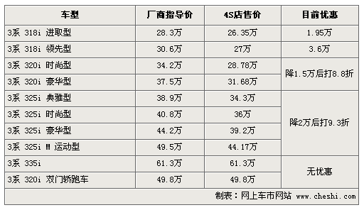 據(jù)4S店銷售人員介紹:目前寶馬3系全部大幅降價(jià),最高降幅達(dá)到5.8萬元。寶馬318系列目前低配車需要預(yù)訂,訂車周期為1個(gè)月,高配車型可優(yōu)惠3.6萬,對(duì)于一款上市未滿一個(gè)月的新車而言,有著較高的性價(jià)比。寶馬320系列兩款車型可以降1.5萬后優(yōu)惠8.8折,325系列可優(yōu)惠2萬后打9.3折。寶馬335i和320i雙門轎跑車無任何優(yōu)惠,預(yù)定車需等6個(gè)月。目前寶馬3系系列下10款車型現(xiàn)車均不多,預(yù)訂最短需等10天左右,最長(zhǎng)需等半年。