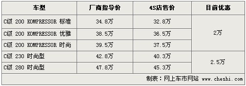 據(jù)4S店銷售人員介紹:目前奔馳C優(yōu)惠幅度較大,全系購(gòu)車送全險(xiǎn),同時(shí)C200K優(yōu)惠達(dá)2萬元,C230、C280優(yōu)惠更是達(dá)到2.5萬元。不過目前現(xiàn)車較少,有些車型需要預(yù)訂,預(yù)定周期為1個(gè)月左右。C200K優(yōu)雅型與C230時(shí)尚型現(xiàn)車較少,C230時(shí)尚型甚至將要停產(chǎn),由于這兩款車價(jià)格與其它3款車型價(jià)格相近,并配置有些令人不滿,所以將要停止生產(chǎn)。