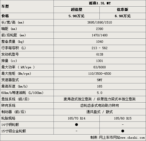 雨燕1.3L超值型的售價(jià)為5.98萬元,比炫彩版要便宜一萬元,在車身尺寸和動力性能方面,這款新車都沒有任何變化。但雨燕1.3L超值型只配備了14寸鋼輪轂和14寸輪胎,而炫彩板則配備的是15寸鋁合金輪轂是15寸輪胎。總的來說,雨燕超值型整車的性能基本上并沒有變化。