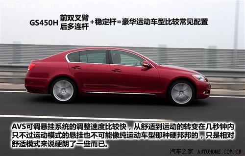 GS450h上裝配的AVS適應(yīng)式可調(diào)懸掛系統(tǒng),可以自動連續(xù)調(diào)整減震器的阻尼。當(dāng)然,也可以通過人工設(shè)置,分為普通和運動兩種狀態(tài)。普通模式下,懸掛和減震系統(tǒng)更多的顧及車內(nèi)舒適程度,偏軟的懸掛和松軟舒適的座椅讓駕駛員很難有想深踩油門的沖動,大部分的路感被懸掛系統(tǒng)吸收,傳進車內(nèi)的只有少數(shù)幅度稍大一點的波動;運動模式下的懸掛系統(tǒng)表現(xiàn)得相對更敏感,對路面信息的傳遞也更清晰一些,但還談不上純正的運動車型的那種硬邦邦的懸掛調(diào)校,畢竟這不是那一類型的車。