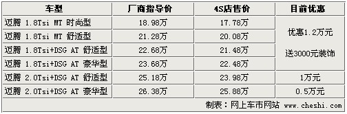 據(jù)4S店銷售人員介紹:目前邁騰最高優(yōu)惠1.2萬元,店內(nèi)購車還可送3000元裝飾,裝飾包括地膠、腳墊、汽車防爆膜等。目前邁騰現(xiàn)車充足,1.8Tsi車型銷量較好,所以車源較為豐富,但2.0Tsi豪華型無現(xiàn)車需預(yù)定,預(yù)定需等20天左右。由于2.0Tsi兩款車型銷量較少,所以優(yōu)惠幅度較少,如果您對動力性要求不是非常高的話,1.8Tsi車型可以滿足您的需求,建議購買。