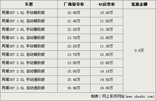 據(jù)東風標致經(jīng)銷店銷售人員介紹,兩廂標致307分為1.6L和2.0L兩種排量,目前全系優(yōu)惠9000元,入門車型的1.6L 手動精致版原廠商指導價為10.98萬元,經(jīng)優(yōu)惠后僅售10.08萬元,排量稍大的2.0L排量的低配車型手動精致版經(jīng)優(yōu)惠后售價為11.38萬元。