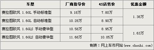 據(jù)經(jīng)銷商處銷售人員介紹,賽拉圖歐風(fēng)全系最高出現(xiàn)了最高1.63萬元的優(yōu)惠。賽拉圖歐風(fēng)在售的有4個車型,入門級的1.6L手動標(biāo)準(zhǔn)版的優(yōu)惠金額為1.38萬元,售價從廠商指導(dǎo)價9.18萬元降到7.80萬元,1.6L豪華版的手動版和自動版車型都經(jīng)全系最高1.63萬元優(yōu)惠后,售價分別降至8.95萬元和10.05萬元。