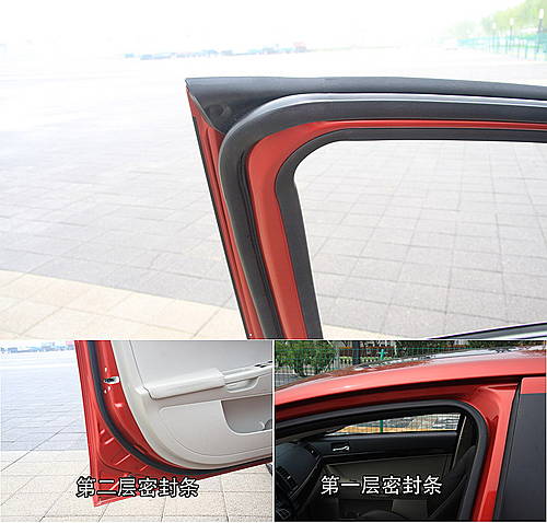 車門密封采用了雙層密封,第二層密封條設(shè)計(jì)巧妙,它的上半部延伸非常像德系車上采用的第三層密封條。密封條尺寸和歐洲車相仿,和較重的車門匹配很好。