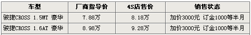 駿捷CROSS上市后,因?qū)儆诜夏贻p人時尚態(tài)度的跨界車型,駿捷CROSS在市場中的受關(guān)注度也相當高。據(jù)華晨中華4S店銷售人員表示,駿捷CROSS上市后已有少量展車到店,主要為1.6L的自動豪華型。而現(xiàn)在購車沒有優(yōu)惠,還需要加價銷售,兩款車型均在指導價的基礎(chǔ)上加價3000元。同時店內(nèi)現(xiàn)車不足,仍需預訂購買,訂金1000元,半個月左右的時間即可提車。
