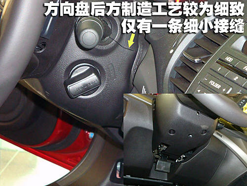 在上面的圖片我們可以非常明顯的看到:在轉(zhuǎn)向柱和鑰匙孔周圍等處的模具工藝比較高,且接縫均勻,整體感較強(qiáng)。思鉑睿的油門和剎車踏板均為橡膠包裹,踏板面積較大,力度適中。并且剎車踏板行程較短,并且很靈敏。