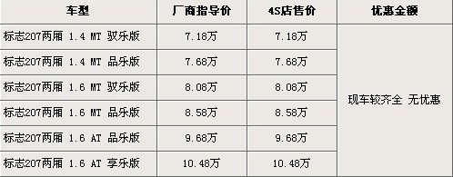 據(jù)東風(fēng)標(biāo)致北京地區(qū)4S店銷(xiāo)售人員介紹,標(biāo)致207兩廂共有6款車(chē)型,售價(jià)區(qū)間為7.18萬(wàn)-10.48萬(wàn)元。目前標(biāo)致207兩廂全系暫無(wú)現(xiàn)金優(yōu)惠,并且現(xiàn)車(chē)比較全。