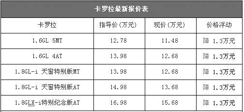 最近一段時間,卡羅拉的銷售情況一直都非常不錯,因此其價格相對來說也比較穩(wěn)定。近日,我們從北京的一些一汽豐田汽車綜合經(jīng)銷商處了解到,目前卡羅拉可優(yōu)惠1.3萬元,比9月份的價格下降了3000元,和其歷史最低價已經(jīng)非常接近。以下是卡羅拉部分車型最新報價表: