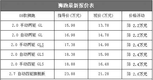 09款獅跑上市后,價(jià)格迅速下降,因此月銷量能夠穩(wěn)定在4000輛左右。我們昨日從北京地區(qū)一家東風(fēng)悅達(dá)起亞獅跑經(jīng)銷商處了解到,近期獅跑部分車型的優(yōu)惠再次增加2000元,最高降幅已經(jīng)增至2.4萬元,性價(jià)比再次提升。目前獅跑最低配車型2.0手動(dòng)兩驅(qū)舒適版的售價(jià)為13.78萬元,和歷史最低價(jià)持平,和競爭對(duì)手途勝售價(jià)非常接近。以下是09款獅跑最新詳細(xì)報(bào)價(jià)表: