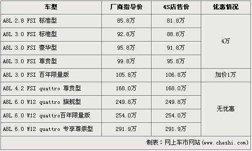 據(jù)北京奧迪經(jīng)銷店銷售人員介紹,目前購買2.8L以及3.0L奧迪新A8L車型的消費(fèi)者,可以得到4萬元的現(xiàn)金優(yōu)惠。經(jīng)優(yōu)惠后,全系入門級(jí)的2.8L標(biāo)準(zhǔn)型的售價(jià)從85.8萬元下降到了81.8萬元。而新上市的3.0L百年限量版車型店內(nèi)只有一輛現(xiàn)車,并且提車需加1萬元,售價(jià)從105.8萬元上升到了106.8萬元。