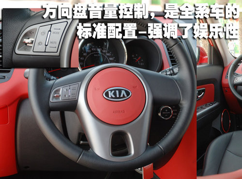 SOUL全系車型的方向盤上方都帶有一個(gè)音響控制按鈕,通過這個(gè)區(qū)域可以控制收音機(jī)、CD、MP3以及各個(gè)音樂模式之間的切換。強(qiáng)調(diào)娛樂性絕對是SOUL設(shè)計(jì)中最大的一個(gè)亮點(diǎn)。不過方向盤本身的造型還是比較普通,和剛剛上市的起亞福瑞迪很是相像。