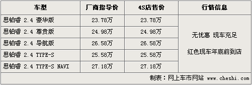 據(jù)東風(fēng)本田4S店銷售人員介紹,目前思鉑睿全系車型無優(yōu)惠,現(xiàn)車比較充足,現(xiàn)車顏色以白色、銀色、藍(lán)色為主。思鉑睿全系提供了塔夫綢白、彩晶黑、鈦金銀、炫影藍(lán)、炫動(dòng)紫五種外觀顏色,以及靜雅黃、靜逸黑兩種內(nèi)飾顏色供消費(fèi)者選擇。TYPE-S車型還推出炫速紅專用色,在年底前現(xiàn)車將會(huì)到店。北京地區(qū)各4S店由于訂單不同,各店銷售的現(xiàn)車顏色有所不同。