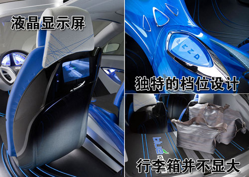 內(nèi)飾方面大量采用了藍色光,車內(nèi)檔位部分采用了類似盾形的設(shè)計,風格大膽,超乎人的想象。在駕駛座后排還安裝有液晶顯示屏幕,同時時尚的行李箱也透出新穎的概念設(shè)計。