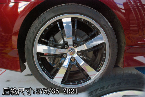 2010款雪佛蘭Camaro全系共分為5款車型,除了最低配車型配備鋼輪轂以外,其他車型均裝配了輪合金輪轂(此次拍攝車輛為全系最高配車型)。輪合金輪轂的造型雖然看起來(lái)很平凡,但是五幅式的亮銀粗輪幅與十幅式黑色細(xì)輪幅相間的效果還是會(huì)讓人流連忘返的。2010款雪佛蘭Camaro前輪的尺寸為245/40 ZR21,后輪的尺寸為275/35 ZR21,由于Camaro是后驅(qū)車型,為了增強(qiáng)抓地力所以驅(qū)動(dòng)輪的橫向截面積會(huì)大于前輪的橫向截面積。前后剎車卡鉗均是由意大利著名的剎車系統(tǒng)生產(chǎn)廠商Brembo代工而成,這么一部?jī)疵偷臋C(jī)器沒(méi)有一套能抑制它的剎車系統(tǒng)怎么能行呢!