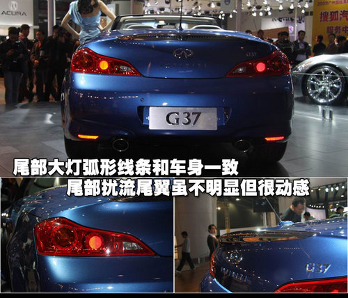 G37敞篷版的尾部大燈設(shè)計與前大燈交相呼應(yīng),同時尾部的小型擾流尾翼也為尾部增添了動感色彩。車身簡潔的線條個性很鮮明,流暢中蘊(yùn)含著無限動能與速度感,讓人過目難忘。