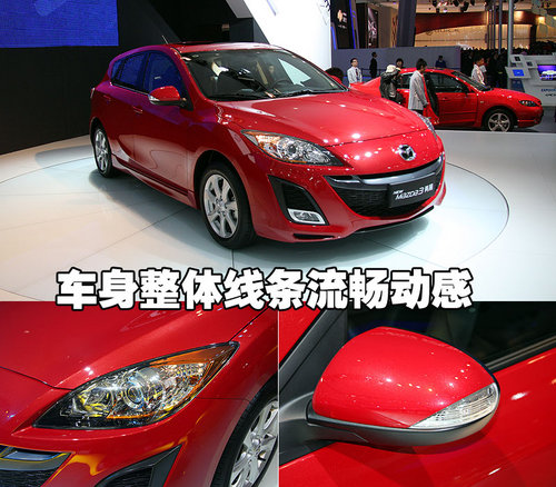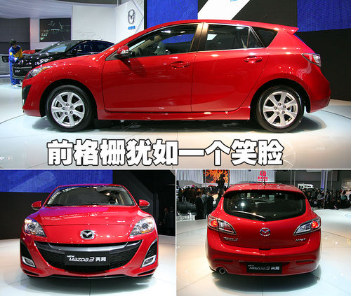 這款即將引入國內(nèi)的全新兩廂馬自達3的前臉設(shè)計,與第二代馬自達6極為相似。寬大的前進氣格柵邊緣微微上翹,猶如一個大大的笑臉。另外,這款車的前霧燈也經(jīng)過了重新設(shè)計,顯得非常運動。
