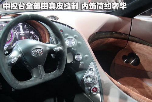 內(nèi)飾設計由英菲尼迪和奢侈品牌LV聯(lián)合完成,風格抽象,采用顛覆傳統(tǒng)的不對稱式設計,黑色駕駛席與紅色客席對比鮮明,中控臺完全集中在駕駛席一側(cè)。內(nèi)飾材質(zhì)以真皮和實木為主,并用大量鋁制配件點綴,突顯運動氣質(zhì)。
