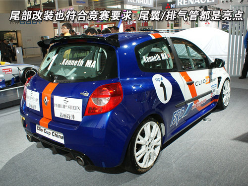 雷諾Clio RS賽車的尾部也為了滿足競技要求而進行了全面的升級,其中最顯眼的就是頂部那個輕量化的尾翼以及車身下部的雙邊排氣管。