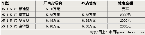 據(jù)奇瑞汽車4S店銷售人員介紹,目前奇瑞A5標準型由于配置太低,4S店內(nèi)無車銷售,其他三款車型現(xiàn)車都比較齊全,F(xiàn)在A5的優(yōu)惠幅度比元旦前要少,只能優(yōu)惠2000元,而且不能贈送裝飾。