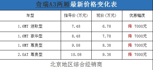 近日,編輯從北京地區(qū)綜合經(jīng)銷商處了解到,奇瑞A3的現(xiàn)車充足,顏色也比較齊全,提供給消費(fèi)者的選擇空間較大;目前購買該車全系都可以優(yōu)惠7000元現(xiàn)金,與之前的降價幅度相比有了小幅度的提升,性價比很不錯。據(jù)經(jīng)銷商透露,消費(fèi)者要想以這個價格購車,需要在店內(nèi)做一條龍服務(wù),其中車輛四項(xiàng)基本險最低可以打7折(約合2500-3000元左右)。以下是奇瑞A3最新價格變化表: