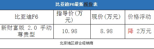比亞迪F3是去年的銷量冠軍,和F3相比,比亞迪F6要低調很多,但是這并不意味著F6的性價比低。昨日,編輯從北京地區(qū)的幾家比亞迪汽車綜合經(jīng)銷商處了解到,近期比亞迪F6的優(yōu)惠再次增加,銷量最高的2.0手動尊貴版目前的降幅已經(jīng)達到了2萬元,購車后如果在店內做一條龍服務的話,還可以再優(yōu)惠2000元,性價比非常不錯。