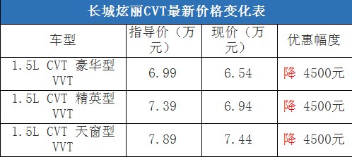 近日,編輯從北京地區(qū)綜合經(jīng)銷商處了解到,購買長城炫麗CVT車型有4500元的現(xiàn)金優(yōu)惠,店內(nèi)有黑色現(xiàn)車在售,部分車型預(yù)定等待10天左右就可以提車。據(jù)經(jīng)銷商透露,消費(fèi)者要想以這個價格提車,需要在店內(nèi)做購車一條龍服務(wù),其中車輛四項(xiàng)基本保險(xiǎn)可以打8折(約合2800-2900元左右)。以下是長城炫麗CVT最新價格變化表: