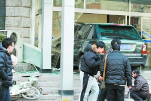 昨天下午4時許,北三環(huán)安華橋西北角的瑞德大廈門前一片狼藉。一輛原本要停車入位的路虎越野車,撞進了大廈門廳左側(cè)的玻璃門。正在門前執(zhí)勤的保安反應(yīng)迅速,才躲開了這只“瘋狂”的“老虎”。