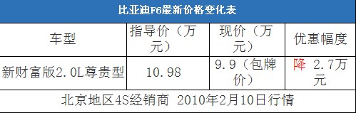近日,編輯從北京地區(qū)比亞迪4S經(jīng)銷商處了解到,近期比亞迪F6有2.0L尊貴版現(xiàn)車(黑色、銀色)。目前這款車在店內(nèi)正在組織消費者團購活動,車輛全款(包括購車一條龍和購置稅、上牌)為9.9萬元,并且贈送價值1000元的汽車裝飾,相當于優(yōu)惠了2.7萬元左右。以下是比亞迪F6最新價格變化表:
