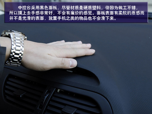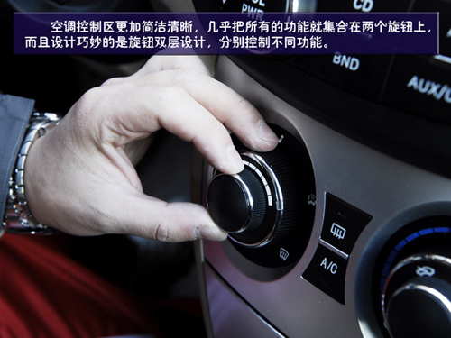 空調(diào)控制區(qū)就更加簡潔了,幾乎把所有的功能就集合在兩個旋鈕上,而且設(shè)計巧妙的是旋鈕雙層設(shè)計,分別控制不同功能。但在使用時我們發(fā)現(xiàn)旋鈕的指示標(biāo)是一個小的凹槽,在光線不足是可以看到是一個小燈,但在白天時這個凹槽并不十分明顯,可能會造成讀取的小障礙。