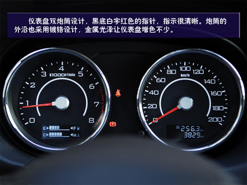 儀表盤雙炮筒設(shè)計與運(yùn)動風(fēng)格相統(tǒng)一,黑底白字紅色的指針,指示很清晰。炮筒的外沿也采用了鍍鉻設(shè)計,金屬光澤讓儀表盤增色不少。轉(zhuǎn)速表的炮筒內(nèi)集成油箱和水溫表,用方格來顯示。時速表炮筒內(nèi)集成公里計數(shù),而這里顯示的分別是總里程和短時里程,不需要切換,讀取更方便。