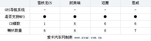 比較遺憾的是四款車都未配備GPS導(dǎo)航系統(tǒng),消費(fèi)者只能另掏腰包。而邁騰1.4T DSG車型在音響方面總共配備了8個(gè)喇叭,同級(jí)比較罕見。