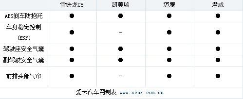車型的安全性配置是購買者非常關(guān)注的一個(gè)因素,我們?yōu)榇蠹疫x取了五種較為常見的主被動(dòng)安全配置進(jìn)行比較。