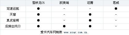 總的來看C5的配置單還是比較有誠意的,基本能做到“人無我有”。比較尷尬的是凱美瑞,作為一款2.4L,價(jià)格在20萬左右的中級(jí)車型,標(biāo)配里不含真皮座椅,也許會(huì)讓一部分消費(fèi)者望而卻步。