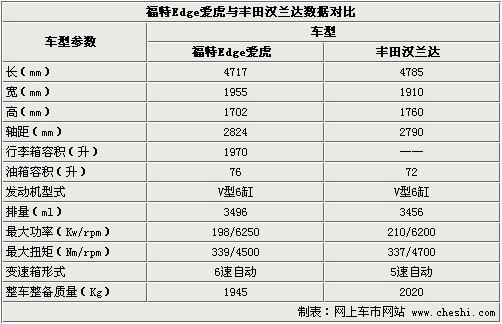 由于2011款Edge銳界并沒有公布官方數(shù)據(jù)及價(jià)格,我們只好利用它的上代車型Edge愛虎做個(gè)比較,看看它的競(jìng)爭(zhēng)對(duì)手到底是誰(shuí)?從上表顯示的數(shù)據(jù)表明,Edge愛虎與國(guó)內(nèi)市場(chǎng)上銷售的豐田漢蘭達(dá)有非常相似之處。無論車身尺寸還是發(fā)動(dòng)機(jī)配備,都有著明顯的競(jìng)爭(zhēng)關(guān)系。由于漢蘭達(dá)的設(shè)計(jì)年份比愛虎更晚,所以在車身長(zhǎng)度及車高方面占據(jù)一定優(yōu)勢(shì)屬于正常現(xiàn)象。兩者且相同配備3.5L V6引擎,只是在變速箱選擇上有所不同。如果單方面從變速箱擋位數(shù)上看,愛虎要比漢蘭達(dá)更先進(jìn)。