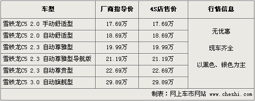 東風(fēng)雪鐵龍C5秉承了雪鐵龍先進(jìn)的創(chuàng)新理念和完美的制造工藝,從外觀到內(nèi)飾的做工充分體現(xiàn)了這款中級車的內(nèi)在價值。同時一系列高端配置以及車身安全性方面均有不俗的表現(xiàn)。根據(jù)網(wǎng)上車市價格監(jiān)測系統(tǒng)顯示,目前C5全系都有現(xiàn)車供應(yīng),車價方面無任何優(yōu)惠。
