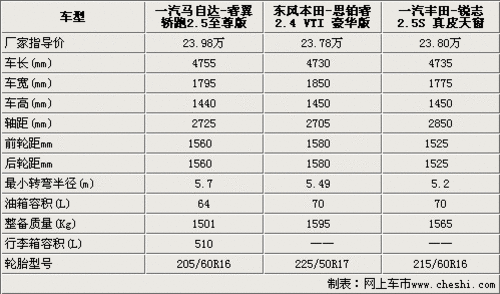 我們選取的三款車型都是位于該車系中黃金排量,售價(jià)都在24萬(wàn)元左右。在車身尺寸方面睿翼轎跑是三款車型中最長(zhǎng)的,同時(shí)睿翼轎跑又是唯一一款采用兩廂半的設(shè)計(jì)車型,這使得睿翼轎跑看起來(lái)動(dòng)感十足。豐田銳志的軸距達(dá)到了2850是3款車型中最長(zhǎng)的,保證了銳志內(nèi)部空間的寬敞。思鉑睿的前后輪距都要大于睿翼轎跑和銳志,達(dá)到了1580mm。同時(shí)在輪胎寬尺寸上也是最大的,這意味著思鉑睿的操控性能將要優(yōu)越于另外兩款車型。睿翼轎跑、思鉑睿和銳志的轉(zhuǎn)彎半徑都在5米左右。思鉑睿和銳志兩款車型的油箱都是70升,足以應(yīng)付一般家庭的正常使用,睿翼轎跑則要小點(diǎn),容積為64升。