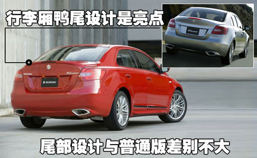 性感的線條運用來到車尾,顯眼的行李廂鴨尾設(shè)計,成為Kizashi車尾的焦點所在。而線條豐富的保險杠造型,以及整合左右雙出尾管的獨特設(shè)計,亦將Kizashi的動感精神表露無遺。