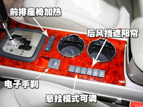 在換擋桿后部的控制區(qū)應該說是瑞麒G6前排的亮點所在,首先電子手剎出現(xiàn)在G6上,座椅加熱這一冬天的貼心裝備也在這個位置,除此之外,瑞麒G6還帶有懸架調節(jié)控制,有三種模式供給駕駛員選擇,同時商務車裝備的后窗遮陽簾也是標配。