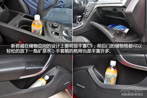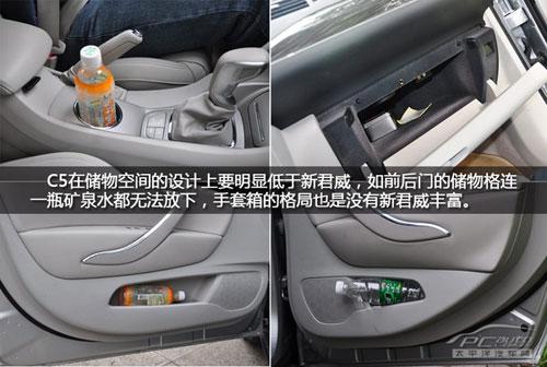 車內(nèi)儲物空間我們用的是“飲料瓶”來衡量看看究竟那款車更人性,新君威車內(nèi)的儲物空間設(shè)計(jì)相當(dāng)人性化,前后側(cè)門的儲物格能放進(jìn)去飲料瓶,手套箱的儲物格局也是很豐富,排擋前方預(yù)留了2個(gè)飲料瓶的儲物槽,但是中控臺上方對于票據(jù)、錢包、手機(jī)等雜物空間設(shè)計(jì)就沒有C5那么人性。