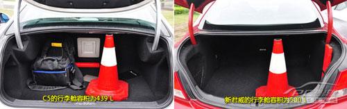 在車身尺寸方面新君威比C5車身長度和高度數(shù)據(jù)要好一些,分別多出25mm和26mm。而軸距上C5卻要長出新君威78mm,也比新君威寬了4mm,在同級車?yán)锩嬉材玫贸鍪郑趯?shí)際體驗(yàn)中,C5的后排頭部空間受益于內(nèi)凹處理方式以增加頭部空間,顯得很充裕,所以無論是商用還是家用空間完全夠用,腿部空間也夠用,而新君威由于軸距較短且是運(yùn)動化的定位,后排空間表現(xiàn)并不理想,腿部空間只能說夠用,且頭部空間則略顯局促。