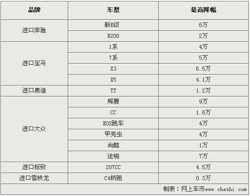 目前來自歐元區(qū)的德系及法系汽車品牌的售價,均有不同程度的提升。由于奔馳、寶馬、奧迪和大眾均為德系品牌,所以部分車型均有大幅讓利。其中大眾輝騰最高優(yōu)惠達9萬元,而奔馳新E和寶馬X3也分別有6萬和6.5萬的優(yōu)惠。除此之外,雪鐵龍和標致等所屬歐元區(qū)的法系汽車品牌也有不同降幅,其中進口標致207CC最高降幅已達4.5萬元。