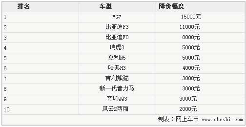 隨著國內(nèi)汽車市場逐漸升溫,很多汽車品牌也開始了市場爭奪戰(zhàn),很多熱門車型在進入五月份以來,都出現(xiàn)了較大的優(yōu)惠幅度。據(jù)網(wǎng)上車市網(wǎng)站了解,很多自主品牌熱門車型在北京汽車市場已經(jīng)開始出現(xiàn)了初步的價格戰(zhàn),比如比亞迪F3、MG7等熱門車型都出現(xiàn)了萬元以上的優(yōu)惠幅度。這對很多消費者來說算是個比較好的消息,接下來讓我們?nèi)チ私庖幌戮烤褂心男┸囆蛢?yōu)惠幅度最多。
