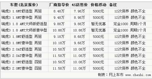由于瑞虎大師版車型剛剛上市,4S店還沒有現(xiàn)車銷售,消費者如果想預(yù)訂此車型需要交納1000元定金,預(yù)計提車周期在1個月左右。雖然大師版沒有現(xiàn)車也暫無優(yōu)惠,但是4S店表示現(xiàn)在購買瑞虎3的其他車型,可享受4000元現(xiàn)金優(yōu)惠,還可以贈送一些裝飾,目前車型顏色并不齊全,白色均無現(xiàn)車需要預(yù)定。