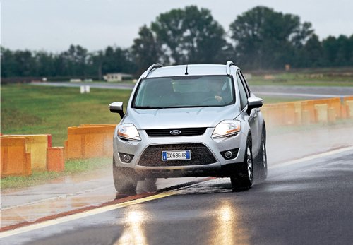 在前面的測(cè)試中,輪胎的附著力很好,本項(xiàng)測(cè)試對(duì)此增加了難度。路面部分濕滑,同時(shí)我們選擇了兩段不同的道路。一段為瀝青路面,另一段為大理石路面,以使測(cè)試更為準(zhǔn)確。大理石路面最為困難,附著力系數(shù)僅約為0.1,這幾乎與冰面無(wú)異,是干燥瀝青路面附著力的十分之一?傊畬(duì)于測(cè)試來(lái)說(shuō)條件十分理想,能準(zhǔn)確測(cè)出四驅(qū)與兩驅(qū)車(chē)的差別。在起步加速中,依靠電子系統(tǒng)的支持(在相當(dāng)于冰面的路面上控制住輪胎,并把扭矩恢復(fù)到相當(dāng)于在瀝青路面上的水平)兩輪前驅(qū)車(chē)才能夠行進(jìn),但防滑系統(tǒng)的報(bào)警燈瘋狂地閃個(gè)不停,雖然很慢,車(chē)子最終還是移動(dòng)了。四驅(qū)車(chē)的表現(xiàn)就從容多了(見(jiàn)下圖的數(shù)據(jù)),但它們也要依靠電子系統(tǒng)的幫助,因?yàn)楸M管四輪驅(qū)動(dòng),可差速器沒(méi)有機(jī)械鎖止裝置,從而也無(wú)法避免劇烈的滑動(dòng)。再來(lái)看看制動(dòng)結(jié)果,盡管人們普遍認(rèn)為四輪驅(qū)動(dòng)對(duì)什么都管用,但這確實(shí)不是四驅(qū)車(chē)的特長(zhǎng),此時(shí)主要依靠ABS和ESP的發(fā)揮,它們?cè)诒M可能地尋找有力的制動(dòng)(有可能使車(chē)輛發(fā)生側(cè)滑)和良好的操控性(有可能延長(zhǎng)剎車(chē)距離)之間的平衡。