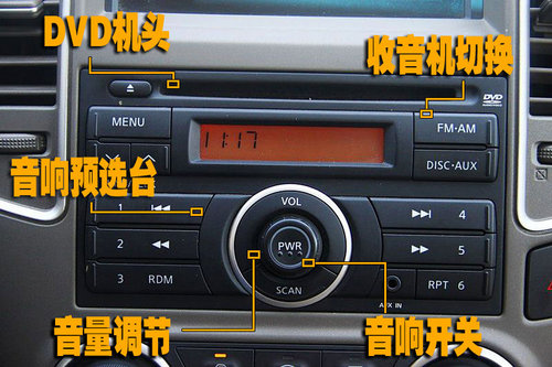 東風(fēng)日產(chǎn)新軒逸高配車型配備6碟CD播放器。值得一提的是新軒逸全系高配車型還可讀DVD格式的光盤。音響按鍵分布合理,按鍵面積較大,十分便于駕駛員和乘客操作。