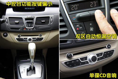 中控臺中細小的按鍵不知道法國人何時能夠為此改變一下,想當初進入到C5車內(nèi)時,被琳瑯滿目的小按鍵搞的暈頭轉(zhuǎn)向,并且在駕駛時我是不敢隨意去觸碰那個區(qū)域的。不過還好拉古那中控臺按鍵并不是很多,空調(diào)區(qū)域的造型很時尚,也很節(jié)省空間,實際操作也非常容易上手,調(diào)節(jié)方式也很簡便。另外老款的拉古那配備的是多碟CD,而新款車型裝配的則是單碟CD音響,在日常使用中,多少會有一些不便。
